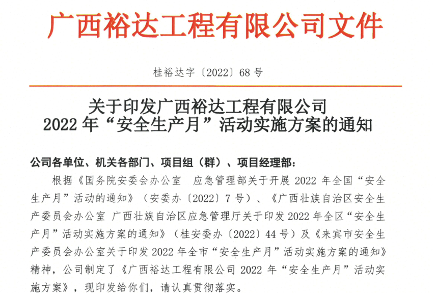 收到通知后公司積極響應貫徹落實并發(fā)布了《關(guān)于印發(fā)廣西裕達工程有限公司2022年“安全生產(chǎn)月”活動實施方案的通知》要求公司全體人員認真深入學習貫徹習近平總書記關(guān)于安全生產(chǎn)重要論述,加強活動組織部署。宣傳貫徹安全生產(chǎn)法,強化主體責任落實。開展全員安全培訓,分類強化警示教育。廣泛開展宣傳,營造良好安全生產(chǎn)氛圍,以優(yōu)異成績迎接黨的二十大順利召開。