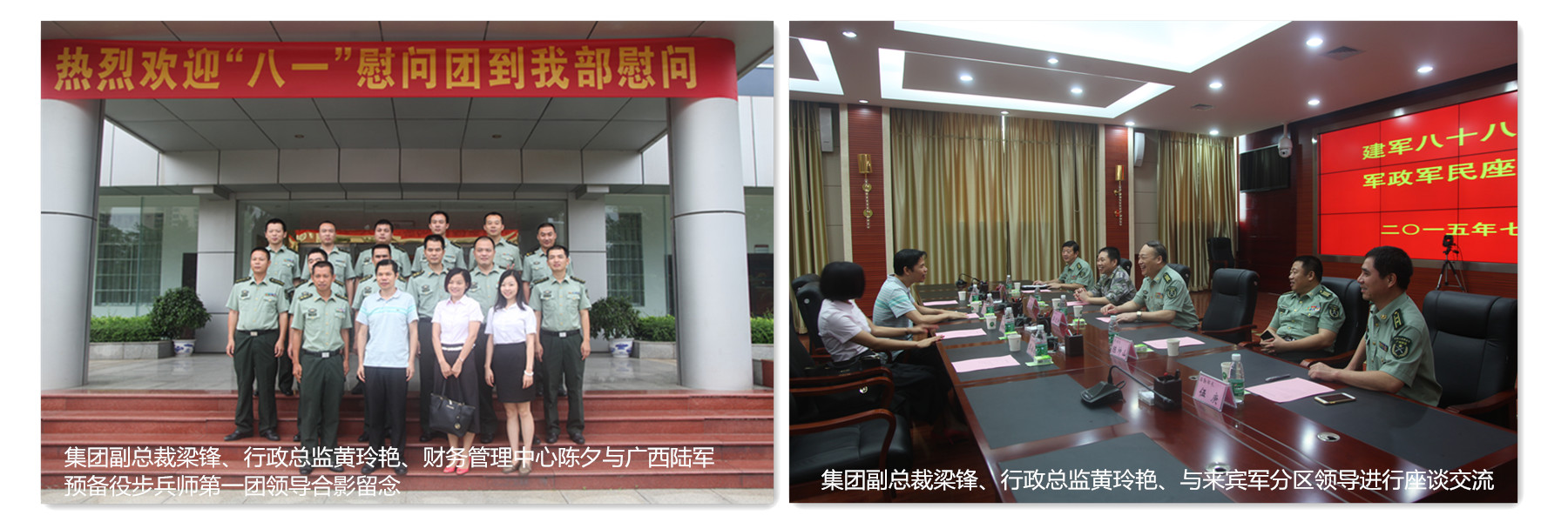 幸福不忘擁軍,安定不忘國防。今年是中國人民抗日戰(zhàn)爭暨世界反法西斯戰(zhàn)爭勝利70周年及建軍88周年。2015年7月31日,在“八一”建軍節(jié)到來之際,我集團副總裁梁鋒與行政總監(jiān)黃玲艷先后走訪慰問了廣西陸軍預(yù)備役步兵師第一團、中國人民解放軍廣西來賓市軍分區(qū)、武警來賓市消防支隊和武警來賓市支隊的官兵,代表集團總裁鄧亞保及全體員工向他們送去節(jié)日的祝福和誠摯的問候,集團財務(wù)管理中心副總經(jīng)理陳汐、行政管理中心行政部副經(jīng)理覃婷婷陪同慰問。 每到一處,集團副總裁梁鋒、行政總監(jiān)黃玲艷都與部隊領(lǐng)導(dǎo)進行座談交流,共敘魚水情,并向子弟兵們送去了慰問金,表達節(jié)日的問候和崇高的敬意,受到了部隊官兵的熱烈歡迎。 一直以來,我集團都十分重視擁軍愛民工作,鞏固軍民魚水之情,密切軍企關(guān)系,堅持每年走訪慰問駐地部隊官兵。通過“八一”慰問和走訪的形式,進一步加深了軍民之間的感情,架起一座與解放軍官兵之間友誼的橋梁,樹立了集團良好的擁軍和對外服務(wù)形象。