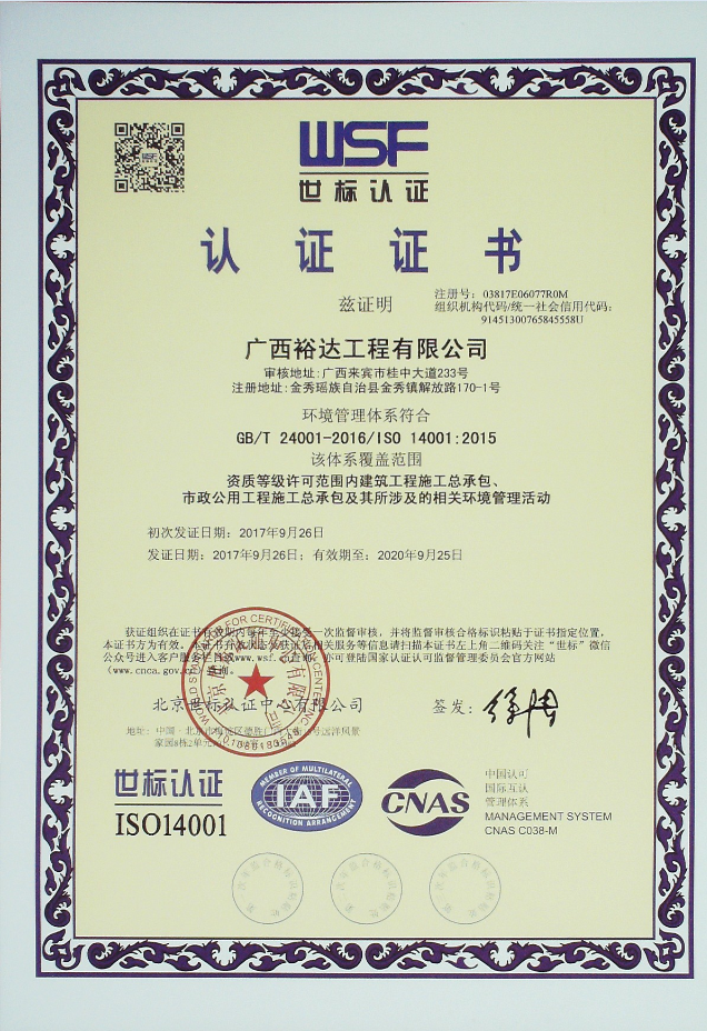 2017年9月7日至16日,經(jīng)過專家組兩輪現(xiàn)場審核,廣西裕達工程有限公司順利通過了GB/T19001-2016《質(zhì)量管理體系》、GB/T24001-2016《環(huán)境管理體系》、GB/T28001—2011《職業(yè)健康安全管理體系》、GB/T50430-2007《工程建設(shè)施工企業(yè)質(zhì)量管理規(guī)范》三標一體的認證,并于2017年9月26日獲得由北京世標認證中心有限公司頒發(fā)的ISO9001:2015、GB/T50430-2007、ISO14001:2015和GB/T 28001-2011的認證證書。