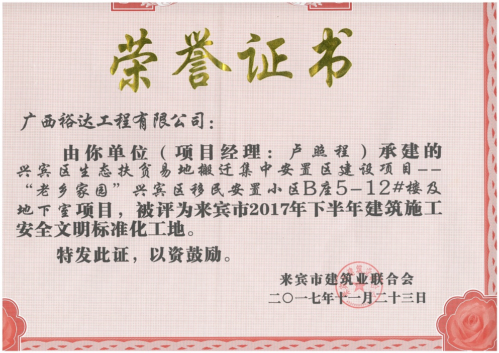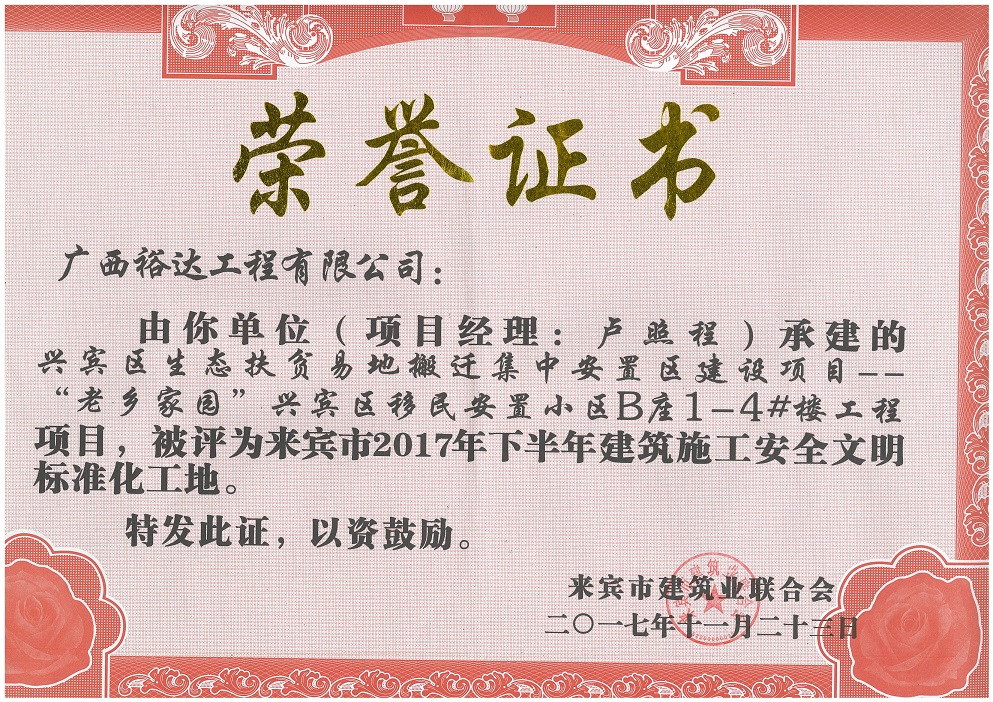 近日,由廣西裕達(dá)工程有限公司承建的興賓區(qū)生態(tài)扶貧易地搬遷集中安置區(qū)建設(shè)項(xiàng)目—“老鄉(xiāng)家園”興賓區(qū)移民安置小區(qū)B座1-4#樓、B座5-12#樓及地下室、裕達(dá)·金碧天譽(yù)A區(qū)1#-4#樓及地下室,共3個(gè)工地榮獲來賓市2017年下半年“安全文明標(biāo)準(zhǔn)化工地”榮譽(yù)稱號。