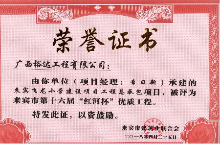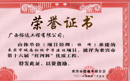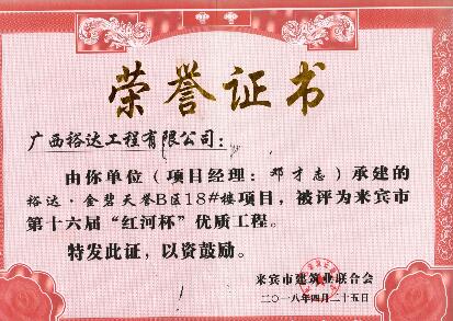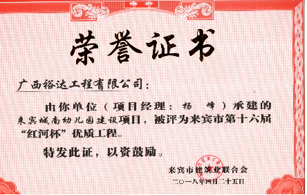 近期,從來賓市建筑業(yè)聯(lián)合會(huì)傳來喜訊,廣西裕達(dá)工程有限公司承建的“來賓城南幼兒園建設(shè)項(xiàng)目”“來賓市城南初級中學(xué)建設(shè)項(xiàng)目”“來賓飛龍小學(xué)建設(shè)項(xiàng)目工程總承包”“裕達(dá)·金碧天譽(yù)B區(qū)17#樓”和“裕達(dá)·金碧天譽(yù)B區(qū)18#樓”共5項(xiàng)工程項(xiàng)目被評為來賓市第十六屆“紅河杯”優(yōu)質(zhì)工程,這是繼2011年至2017年榮獲的25項(xiàng)“紅河杯”優(yōu)質(zhì)工程之后,再獲此榮譽(yù)。