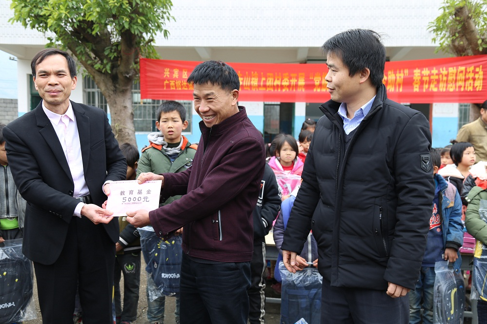 與興賓區(qū)委辦等一行在上團村小學(xué)捐贈教育基金及書包等學(xué)習(xí)用品