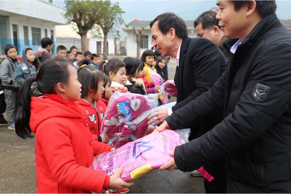 集團黨支部書記謝家偉與興賓區(qū)委辦副主任楊杰為學(xué)生送去書包