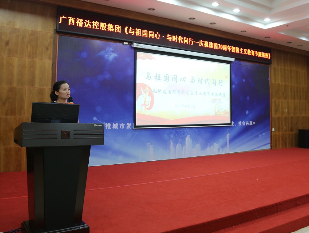 2019年是新中國成立70周年,也是集團(tuán)公司成立15周年,在祖國70歲誕辰即將到來之際,為加強(qiáng)集團(tuán)員工愛國愛黨精神文明建設(shè),加強(qiáng)集團(tuán)黨員思想政治建設(shè),充分發(fā)揮黨建引領(lǐng)作用,2019年9月17日晚7點(diǎn)集團(tuán)黨支部、來賓市興賓區(qū)城北街道黨工委聯(lián)合邀請(qǐng)來賓市黨校羅克良副教授到集團(tuán)公司開展“與祖國同心.與時(shí)代同行”慶祝建國70周年愛國主義教育專題講座,集團(tuán)副總裁喬景坤、集團(tuán)行政總監(jiān)黃玲艷、集團(tuán)黨支部書記謝家偉及支部黨員、預(yù)備黨員、集團(tuán)總部各中心、各公司主管級(jí)及以上人員200多人參加活動(dòng),異地子分公司視頻參訓(xùn),城北街道黨工委組織干事盧玉妮受邀參加活動(dòng)。