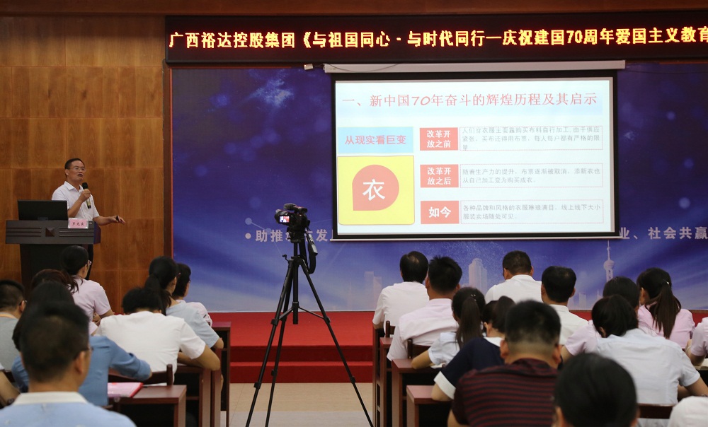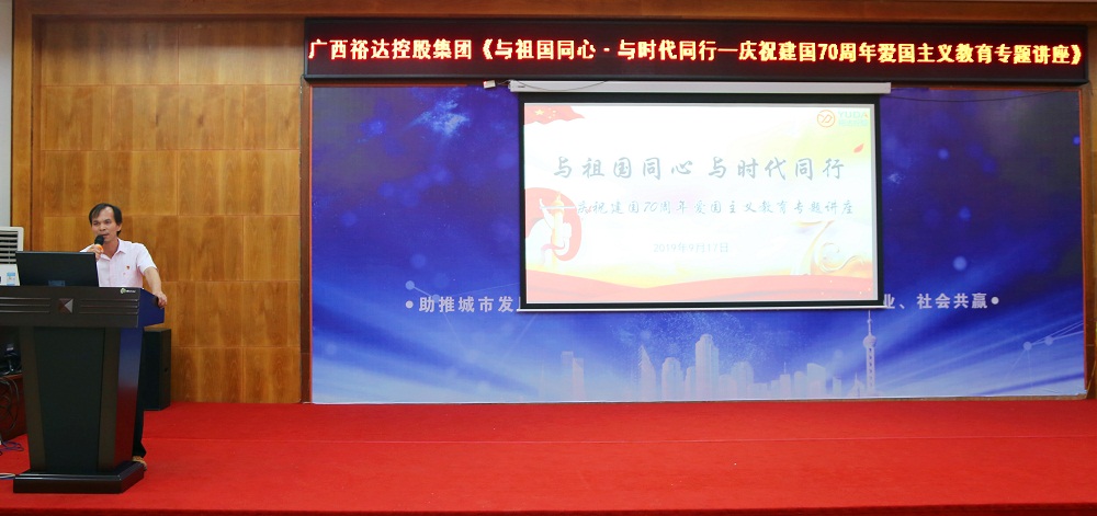 “我們?nèi)f眾一心,冒著敵人的炮火,前進(jìn),前進(jìn)……”,講座開始前奏響中華人民共和國國歌,會(huì)場(chǎng)全體人員起立,雄壯、嘹亮的歌聲在會(huì)場(chǎng)回響,大家都挺起脊梁和胸膛,跟著樂曲一起高唱國歌,在這神圣、莊嚴(yán)的時(shí)刻一股使命感、責(zé)任感在與會(huì)人員的心頭油然而生。國歌結(jié)束后,集團(tuán)行政總監(jiān)黃玲艷致辭,黃總監(jiān)對(duì)羅教授的蒞臨表示熱烈歡迎和誠摯的感謝,并就今晚的講座主題向與會(huì)人員分享了三點(diǎn)看法“1.公司員工應(yīng)當(dāng)遵紀(jì)守法,維護(hù)社會(huì)公德;2.公司領(lǐng)導(dǎo)干部要自我強(qiáng)化,敢于擔(dān)當(dāng),創(chuàng)造價(jià)值;3.黨支部要加強(qiáng)員工的政治思想建設(shè),發(fā)揮黨組織先鋒模范作用”。之后,由來賓市黨校羅克良副教授為大家授課,課程內(nèi)容共分為四個(gè)部分:第一部分為新中國成立70年奮斗輝煌歷程及啟示,羅教授從國內(nèi)生產(chǎn)總值GDP數(shù)據(jù),從脫貧人口數(shù)據(jù),從人民衣食住行的現(xiàn)實(shí)分析改革開放前后至今天新中國的巨大變化,從“兩彈一星”、恢復(fù)聯(lián)合國席位等十大喜事、“中國橋”、“中國路”等中國五大圓夢(mèng)工程生動(dòng)的講述了新中國的偉大成就,并總結(jié)了新中國70年的奮斗史我們帶來的啟示就是“必須始終堅(jiān)持中國共產(chǎn)黨的領(lǐng)導(dǎo),必須凝聚于愛國主義的磅礴力量”;第二部分為愛國主義是中華民族精神的核心,羅教授講到“正是在以愛國主義為核心的偉大民族精神的支撐和引領(lǐng)下,中華民族才能歷經(jīng)磨難而不倒、飽經(jīng)滄桑而不散,列強(qiáng)幾欲分割中國而不裂”,并帶領(lǐng)大家重溫習(xí)總書記關(guān)于愛國主義的真情話語;第三部分為堅(jiān)定不移高舉理性愛國主義旗幟,羅教授結(jié)合當(dāng)前現(xiàn)實(shí)中實(shí)際案例分析了什么是“理性愛國主義”“非理性愛國主義”,并強(qiáng)調(diào)“愛國必須是理性的,愛國不能傷害國家、人民,不能給國家形象帶來傷害,要實(shí)現(xiàn)中國夢(mèng)必須高舉理性愛國主義旗幟”;第四部分為共產(chǎn)黨員要帶頭做愛國主義的實(shí)踐者,羅教授認(rèn)為共產(chǎn)黨員應(yīng)當(dāng)從“愛國必須愛黨、愛國必須愛社會(huì)主義、愛國必須愛人民、愛國必須愛軍、愛國必須愛崗敬業(yè)”五個(gè)方面做愛國主義的實(shí)踐者。最后,羅教授以“站在新的歷史起點(diǎn)上,全黨要更加緊密地團(tuán)結(jié)在以習(xí)近平同志為核心的黨中央周圍,不忘初心、牢記使命,以新的精神狀態(tài)和奮斗姿態(tài)把中國特色社會(huì)主義推向前進(jìn)”為結(jié)束語,講座在一片熱烈的掌聲中圓滿結(jié)束。