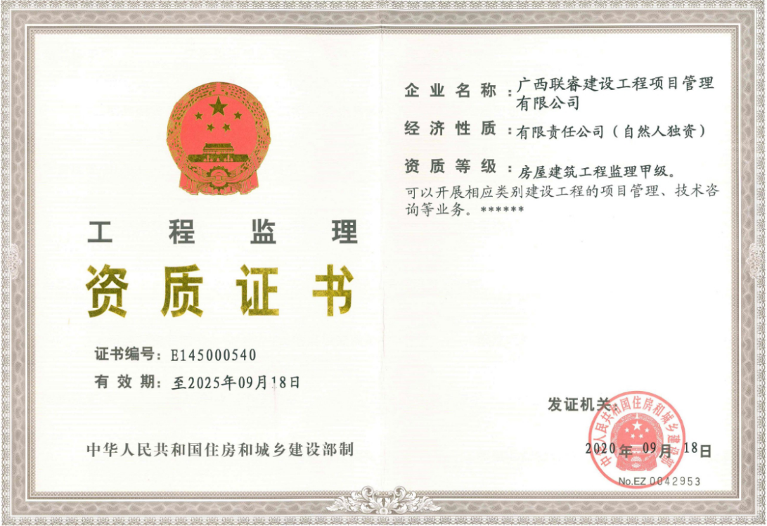 2020年10月9日,聯(lián)睿公司正式收到國家住建部下發(fā)的新資質(zhì)證書,標(biāo)志著聯(lián)睿公司升甲工作圓滿成功。