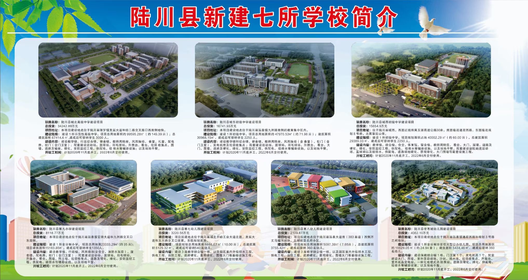 據(jù)悉,陸川縣新建七所學(xué)校項(xiàng)目包括七個(gè)子項(xiàng)目,即新建1所高中、2所初中、1所小學(xué)和3所幼兒園(包括陸川縣城北高級(jí)中學(xué)、陸川縣城東初級(jí)中學(xué)、陸川縣城西初級(jí)中學(xué)、陸川縣第九小學(xué)、陸川縣第七幼兒園、陸川縣第八幼兒園、陸川縣世客城幼兒園),總建筑面積約15.87萬(wàn)㎡,項(xiàng)目估算總投資約8.42億元,工期為730天。