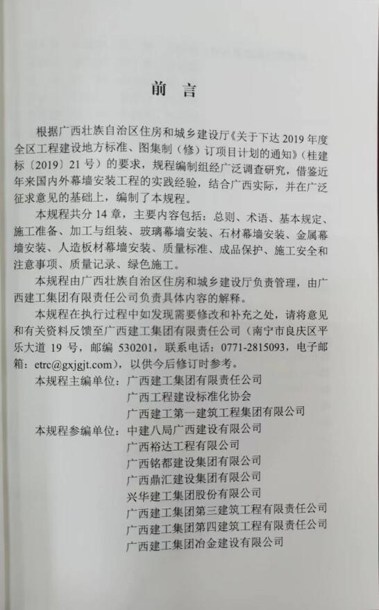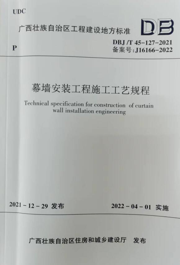 近日,由公司參編的《幕墻安裝工程施工工藝規(guī)程》的廣西工程建設(shè)地方標(biāo)準(zhǔn),經(jīng)廣西住房和城鄉(xiāng)建設(shè)廳批準(zhǔn)發(fā)布,于4月1日起正式實(shí)施。