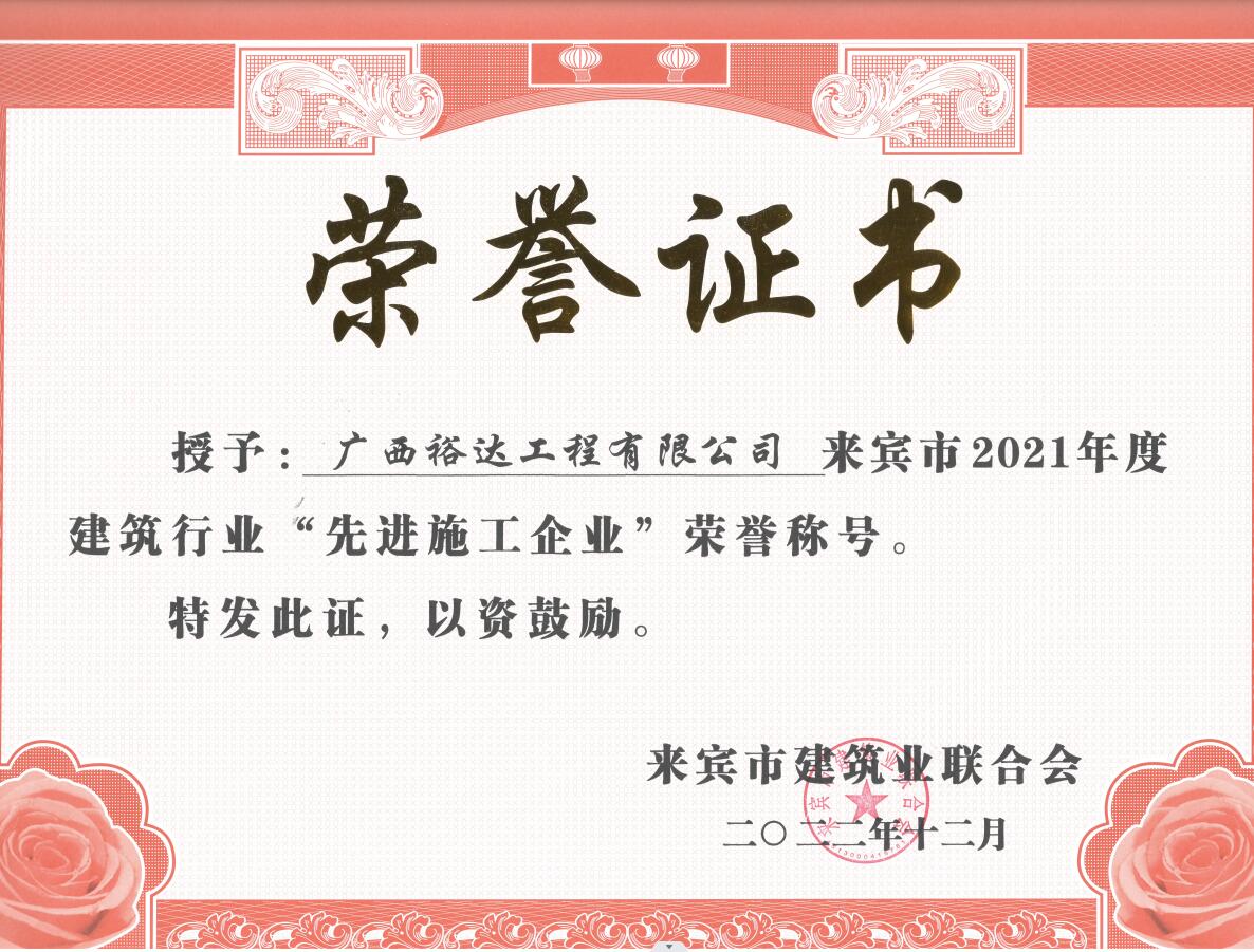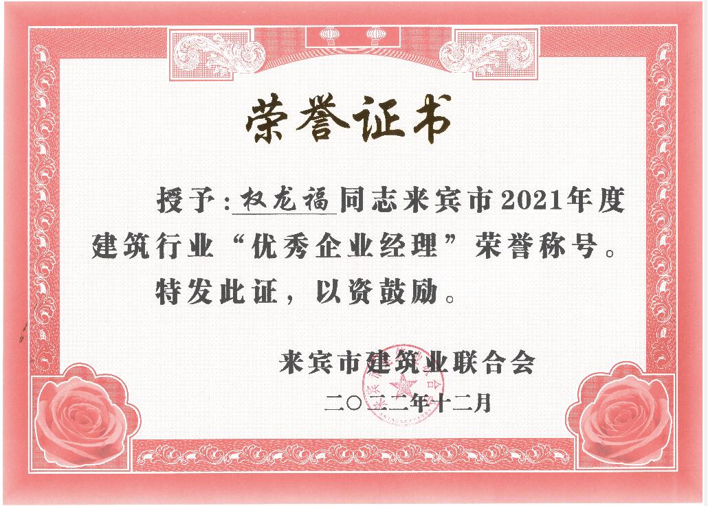 來賓市住房和城鄉(xiāng)建設(shè)局對來賓市建筑行業(yè)2021年度的先進(jìn)集體和優(yōu)秀個人進(jìn)行表彰,工程公司獲“來賓市建筑業(yè)先進(jìn)企業(yè)”榮譽(yù),公司總經(jīng)理權(quán)龍福還被評為“來賓市建筑業(yè)優(yōu)秀企業(yè)經(jīng)理”,公司徐海兵等8位員工被評為“來賓市建筑業(yè)優(yōu)秀建造師”;公司胡海深等8位員工被評為“來賓市建筑業(yè)優(yōu)秀安全員”。這些榮譽(yù)是公司全體員工一直以來辛勤耕耘和默默無聞奉獻(xiàn)的結(jié)果以及肯定,是工程公司綜合實力不斷提升和行業(yè)良好信譽(yù)的再次體現(xiàn),顯示工程公司得到社會和同行的認(rèn)可,必將“裕達(dá)品牌”的影響力和競爭力提上新的臺階。