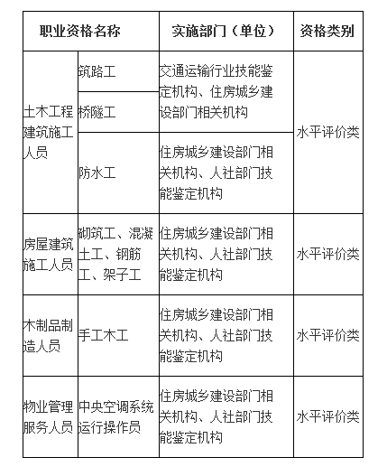 根據(jù)2017年9月人社部公布的最新版“國家職業(yè)資格目錄”,技能人員職業(yè)資格共有81項,由住建部門負責(zé)實施的有以下幾項: