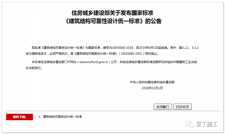現(xiàn)批準(zhǔn)《建筑結(jié)構(gòu)可靠性設(shè)計統(tǒng)一標(biāo)準(zhǔn)》為國家標(biāo)準(zhǔn),編號為GB50068-2018,自2019年4月1日起實(shí)施。其中,第3.2.1、3.3.2條為強(qiáng)制性條文,必須嚴(yán)格執(zhí)行。原《建筑結(jié)構(gòu)可靠度設(shè)計統(tǒng)一標(biāo)準(zhǔn)》(GB50068-2001)同時廢止。