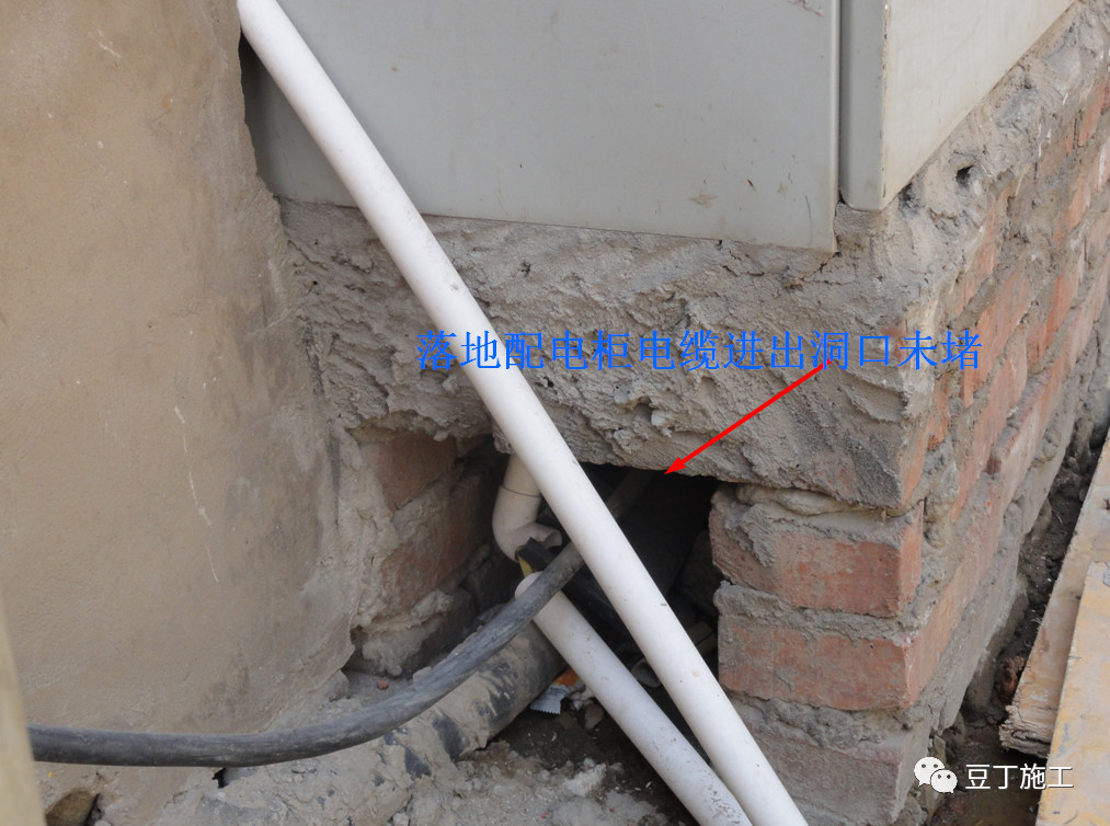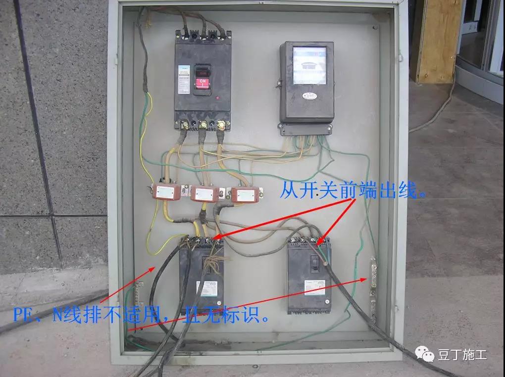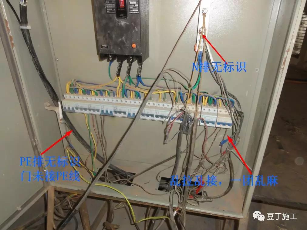 9、PE線、N線從開關(guān)箱內(nèi)引出不規(guī)范。不是按要求從PE、N端子板引出,而是象蜘蛛網(wǎng)一樣互相繞接后引出,亂拉亂接。違反強(qiáng)制性條文8.1.11條規(guī)定。