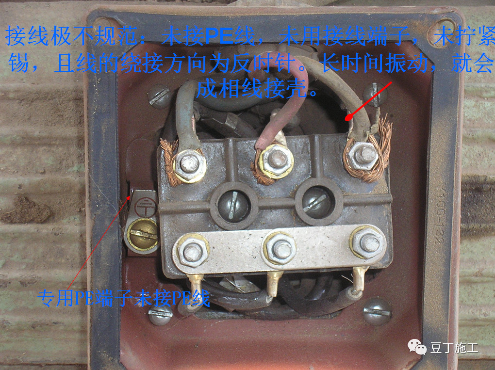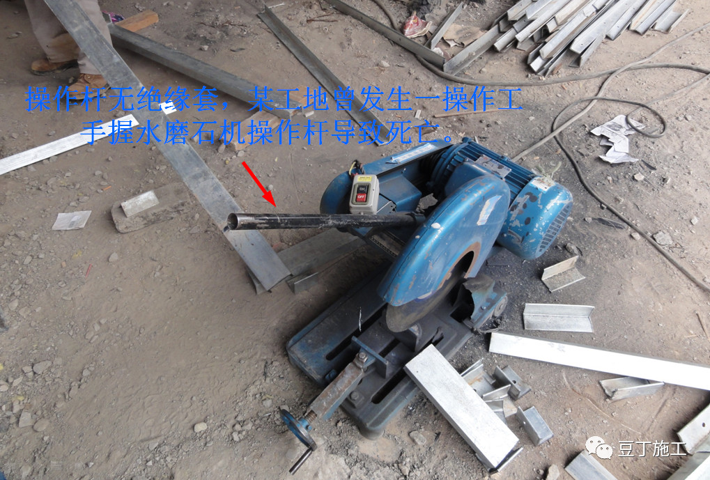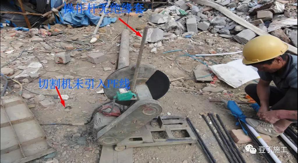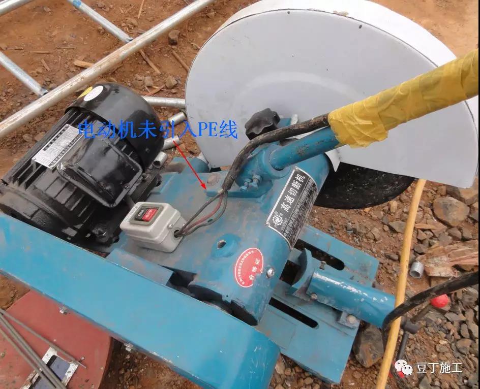 3、施工現(xiàn)場(chǎng)的施工機(jī)具,如電焊機(jī)、對(duì)焊機(jī)、碘鎢燈等外殼不接PE線;鋼筋彎曲機(jī)、鋼筋剪切機(jī)、切割機(jī)、臺(tái)鉆、打氣泵等電動(dòng)機(jī)的接線盒內(nèi)的專用PE端子95%以上不接PE線,而且多數(shù)的操作把手無絕緣套。這是最普遍、最嚴(yán)重地違規(guī)。