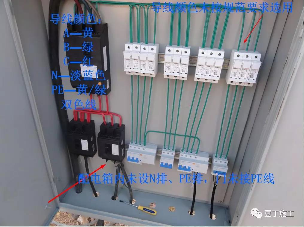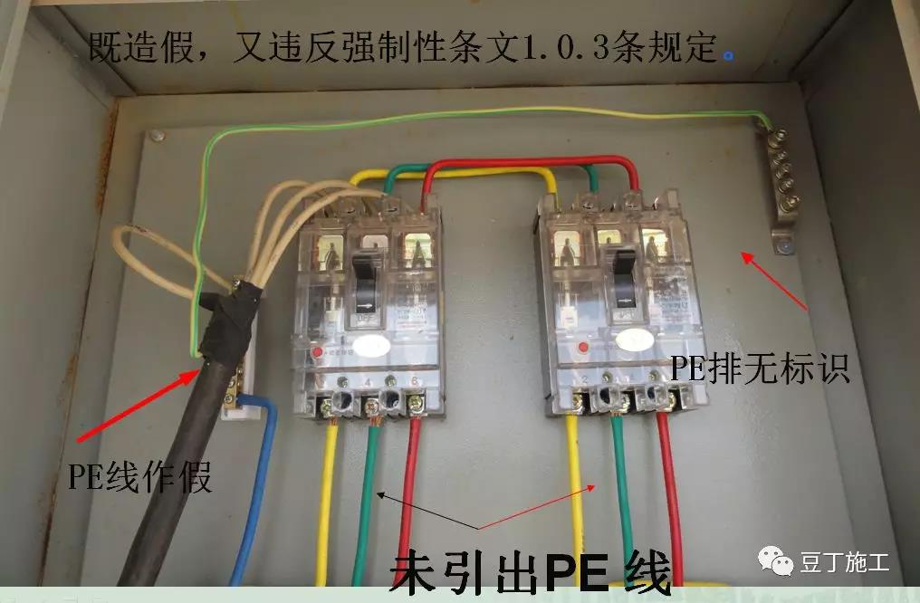 5、開關(guān)柜(總配電箱)不設(shè)PE母線、N母線端子排。二級(jí)配電箱不設(shè)PE線、N線端子排,亂拉亂接。違反強(qiáng)制條文8.1.11條規(guī)定。