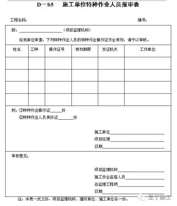 有特殊作業(yè)人員,需向項(xiàng)目部上報(bào)其工程相應(yīng)的合格有效的特殊工程作業(yè)人員操作證復(fù)印件(如:電工、電氣焊工、架子工、起重司索工、起重司機(jī)、起重機(jī)械安拆工、吊籃安拆工、場(chǎng)內(nèi)機(jī)動(dòng)車駕駛員、樁工等)。