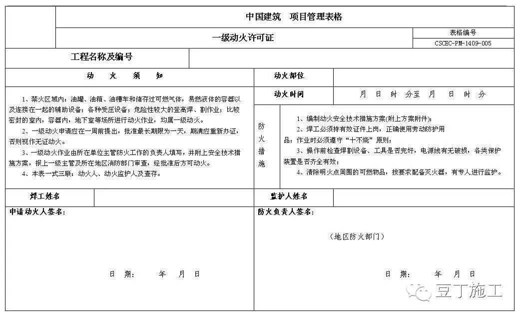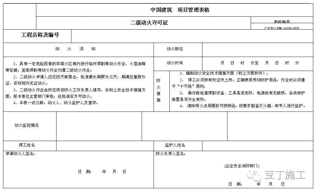 3)三級(jí)動(dòng)火作業(yè)由所在班組填寫,經(jīng)本單位項(xiàng)目部施工負(fù)責(zé)人審查批準(zhǔn),方可動(dòng)火。