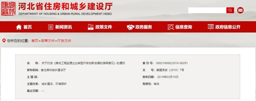 2019年河北省住建廳發(fā)布關(guān)于印發(fā)《推動(dòng)工程監(jiān)理企業(yè)轉(zhuǎn)型升級(jí)創(chuàng)新發(fā)展的指導(dǎo)意見(jiàn)》的通知。明確: