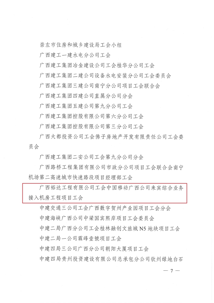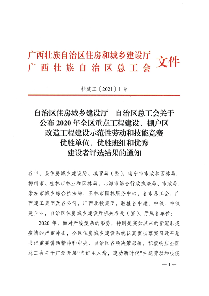 近日,從自治區(qū)住建廳及自治區(qū)總工會(huì)獲悉,工程公司自營(yíng)項(xiàng)目—中國(guó)移動(dòng)廣西來賓綜合業(yè)務(wù)接入機(jī)房工程(簡(jiǎn)稱“移動(dòng)項(xiàng)目”)再獲表彰,榮獲“2020年度全區(qū)重點(diǎn)工程建設(shè)示范性勞動(dòng)和技能競(jìng)賽優(yōu)勝班組”和“2020年度全區(qū)住房城鄉(xiāng)建設(shè)系統(tǒng)先進(jìn)職工小家”榮譽(yù)稱號(hào)。