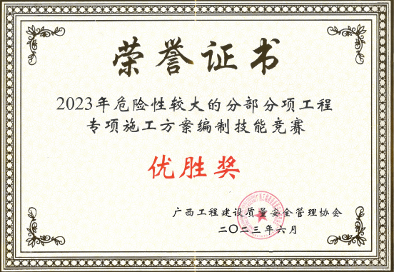 6月29日,工程公司在南寧參加由廣西工程建設(shè)質(zhì)量安全管理協(xié)會主辦的2023年全區(qū)建設(shè)工程危大工程專項施工方案編制技能晉級決賽,喜獲優(yōu)勝獎。