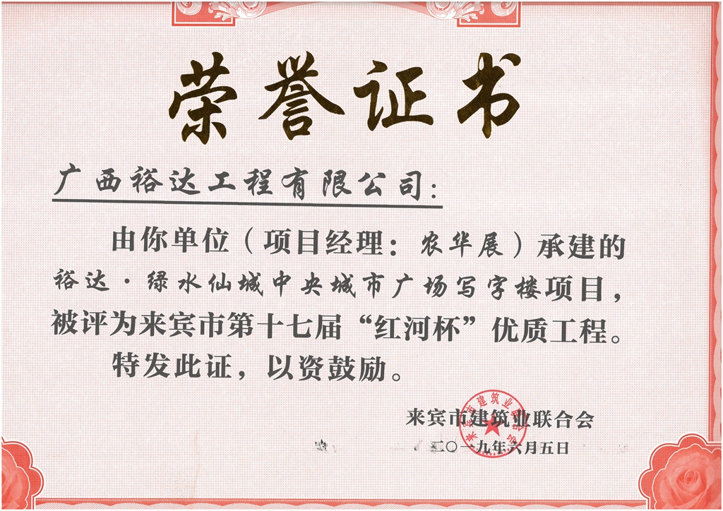 下一篇:裕達(dá)·綠水仙城大城小愛(ài)2#樓項(xiàng)目評(píng)為來(lái)賓市第十七屆”紅河杯“優(yōu)質(zhì)工程(項(xiàng)目經(jīng)理:施靜涵)