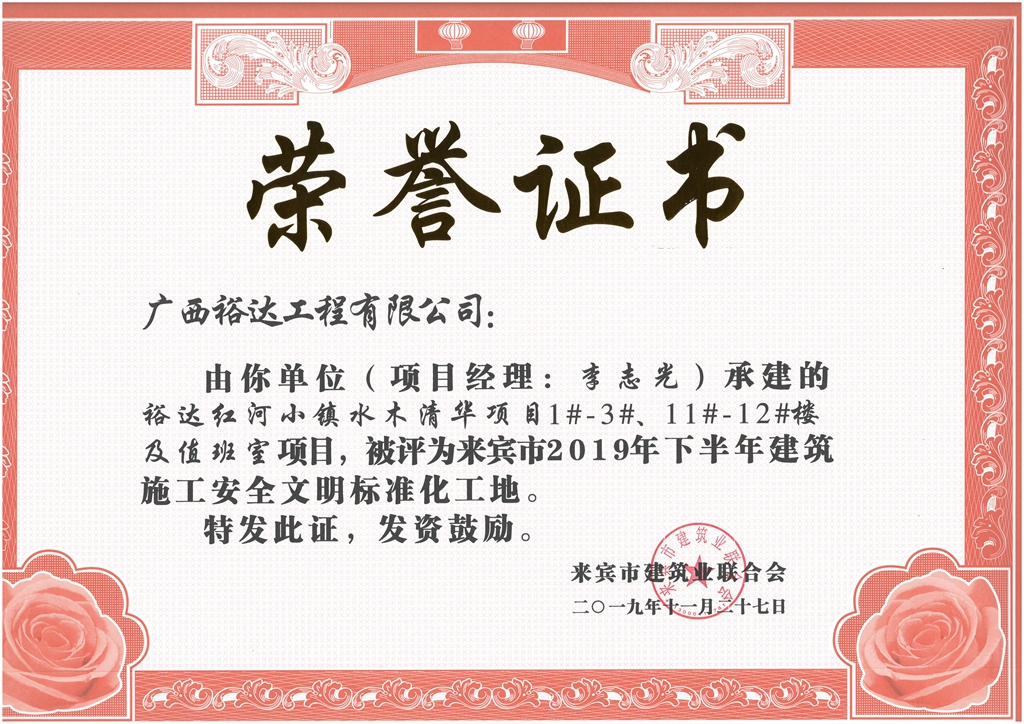 上一篇:裕達(dá)天悅城·萊茵公館2#、5#樓及地下室被評(píng)為來賓市2019年下半年建筑施工安全文明標(biāo)準(zhǔn)化工地(項(xiàng)目經(jīng)理:胡斌) |