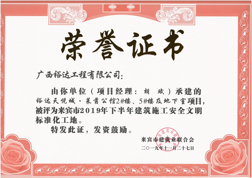下一篇:裕達紅河小鎮(zhèn)水木清華項目1#-3#、11#-12#樓及值班室項目被評為來賓市2019年下半年建筑施工安全文明標準化工地(項目經(jīng)理:李志光)